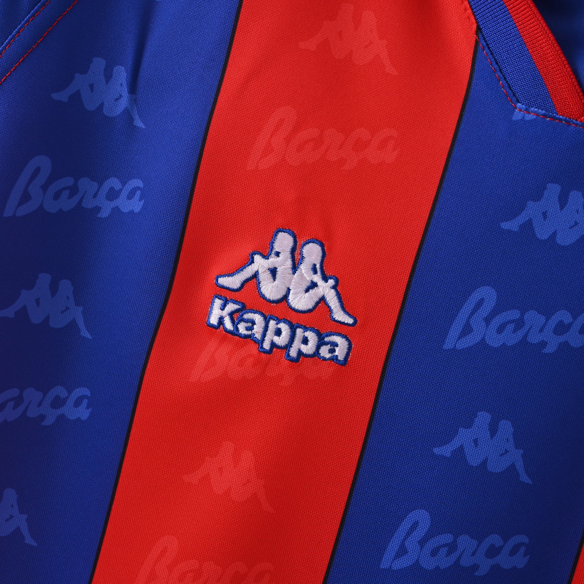 Tejido sublimado con la palabra "Barça" y el logo de Kappa repetidos por toda la camiseta.